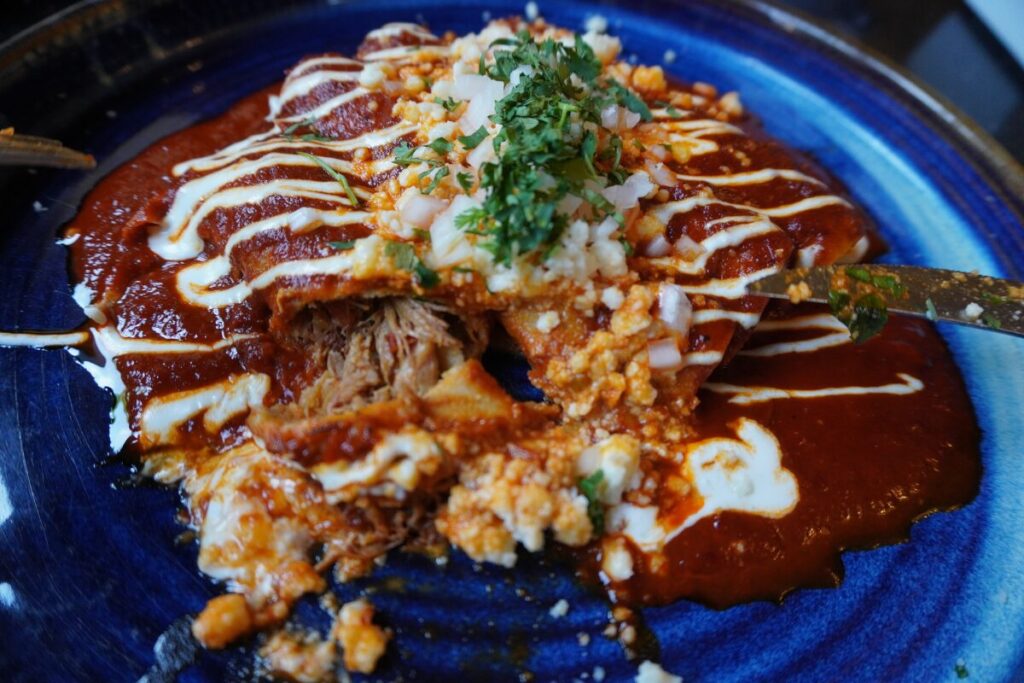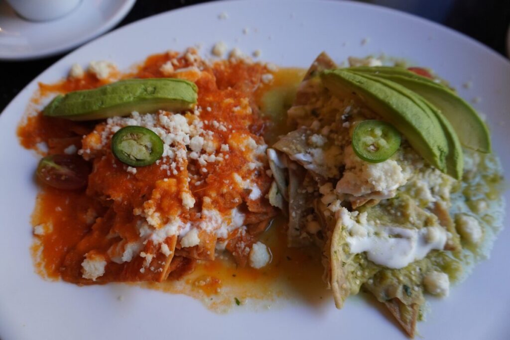 - 味の感想:サルサ・ロハ(赤)とサルサ・ベルデ(緑)の2種類のソースがトーストされたトルティーヤにしっかり染み込んでいます。濃厚なチーズとクリーミーなアボカドを一緒に頬張れば、まさに「メキシコの朝」を感じる至福の瞬間。ボリュームも満点で、一日観光するパワーをチャージするのにぴったりです。