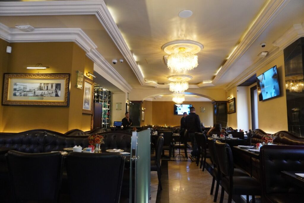 一歩足を踏み入れると、そこには外の喧騒を忘れさせる上品な空間が広がっています。 高い天井にはいくつもの豪華なシャンデリアが輝き、重厚なレザー調のソファー席が並びます。いわゆる「高級レストラン」の格式を感じさせつつも、朝の時間帯はほどよくリラックスした空気が流れており、ゆったりと食事を楽しむことができます。