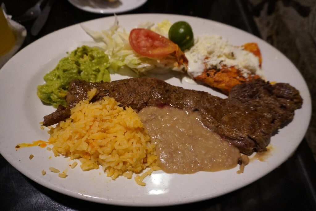 カルネアサダのプレート。牛肉の横にはワカモレ、豆のペースト、エンチラーダまで添えられた豪華版。