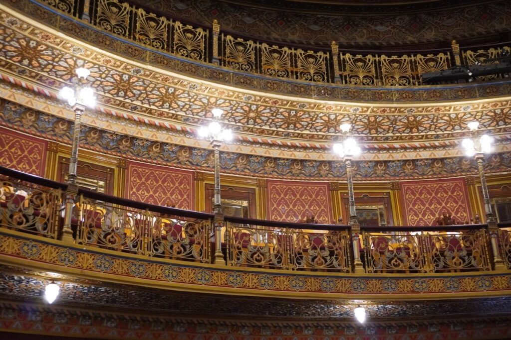- ネオ・ムデハル様式: 赤、金、青を多用した幾何学的な装飾は、スペインの影響を受けたイスラム風の様式です。