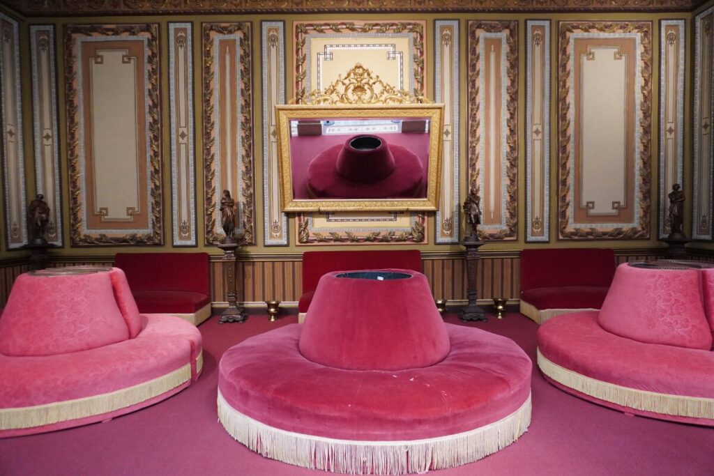 このサロンには、当時のフランス製家具や大きな鏡、ブロンズ像が置かれており、当時の上流階級の優雅な社交風景が目に浮かぶようです。