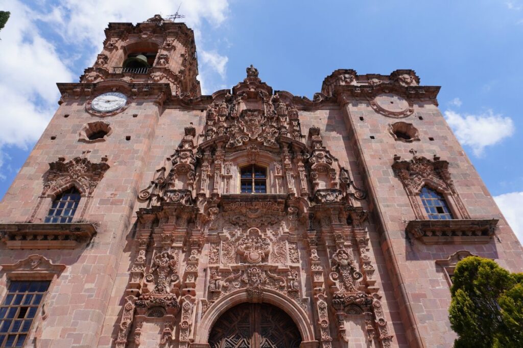 教会の外観は、グアナファトらしい温かみのあるピンク色がかった石(カンテラ)造り。青空とのコントラストが非常に美しいです。