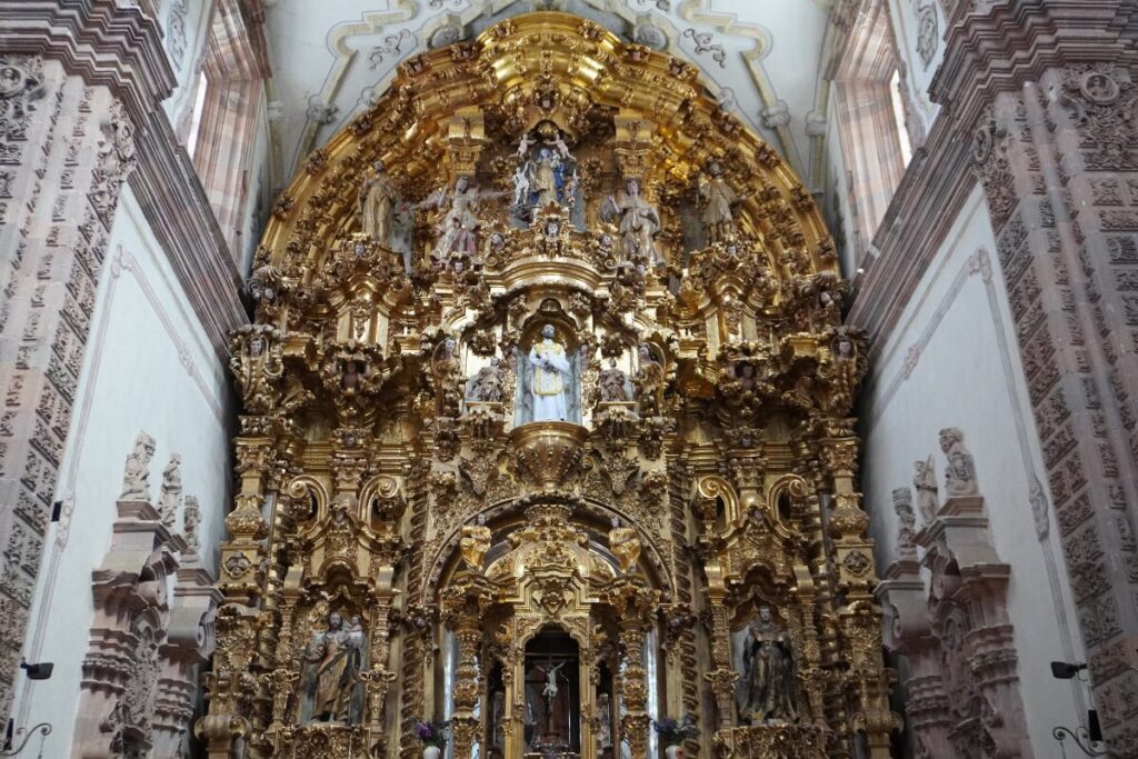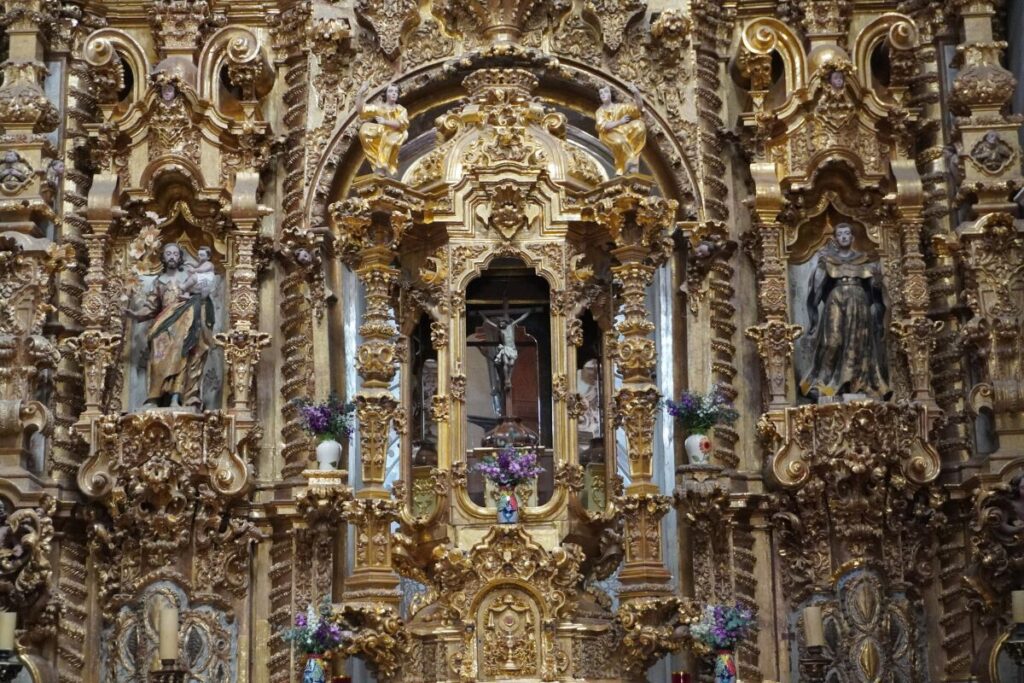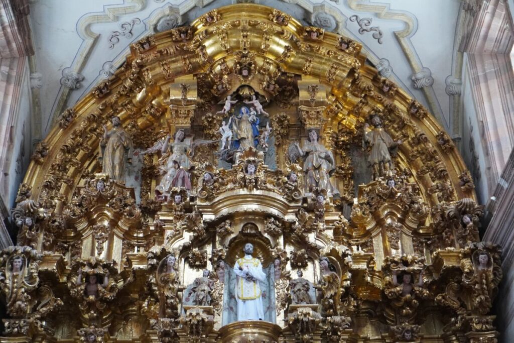 教会最奥部に鎮座する、圧巻の主祭壇(レタブロ)。床から天井までを埋め尽くす金箔装飾は、まさに“金の暴力”と呼ぶに相応しい。
