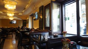 観光地の中心とは違い、商売っ気が強すぎず、どこかゆるいローカル空間が広がっているのも魅力です。教会の黄金の世界を堪能した後は、この広場でベンチに座り、のんびりと地元の空気を吸うのがおすすめ。