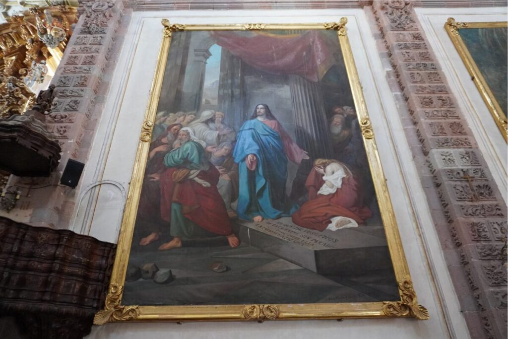 豪華な金色の額縁に収められた巨大な宗教画。左側には十字架降架の場面、右側にはキリストと弟子たちの場面が描かれている。