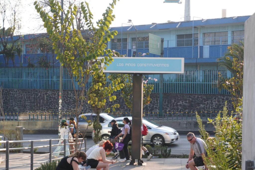 地上出口を出たら、案内板をチェック。少し道なりに歩きますが、**「LOS PINOS CONSTITUYENTES駅」**のサインが見えるまで徒歩3〜5分ほどです。