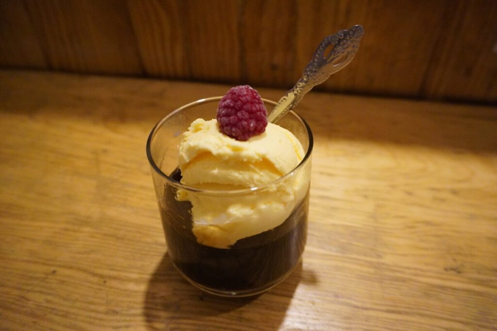 ほろ苦いコーヒーゼリーの上に、濃厚なバニラアイスとラズベリーが添えられています。食後のコーヒー代わりにもなり、甘さと苦味のバランスが絶妙。満足度をもう一段階引き上げてくれる、外せない締めくくりです。