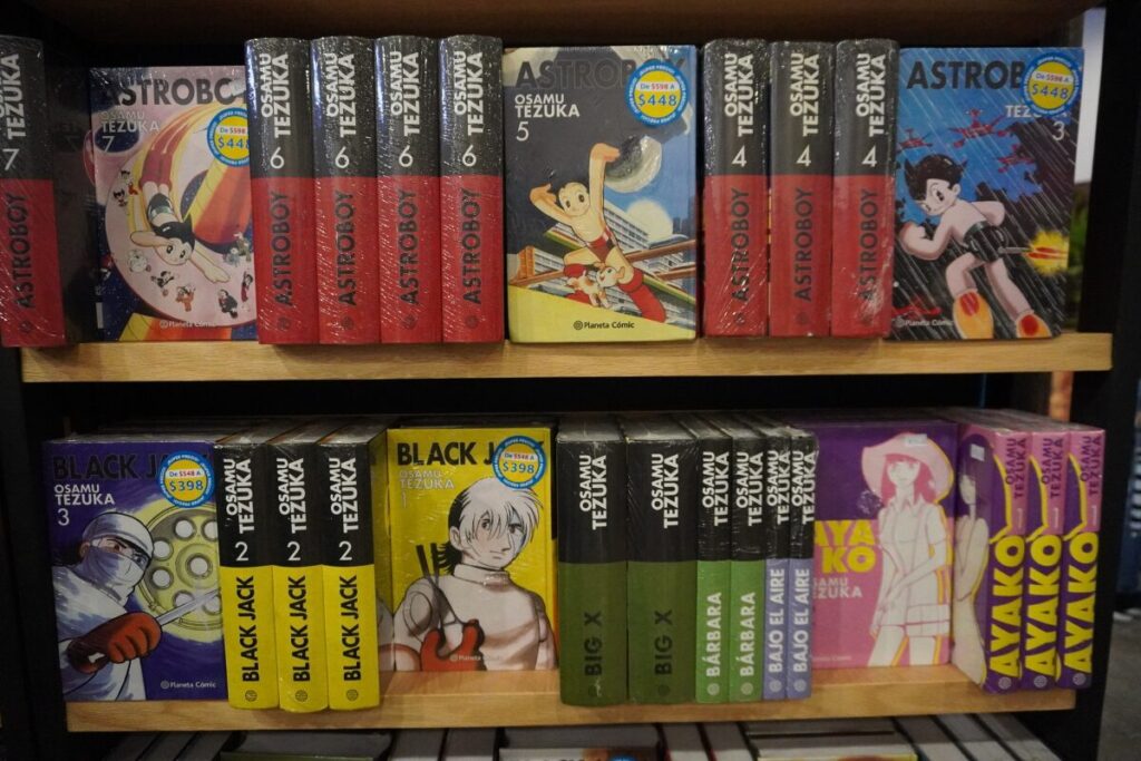 スペイン語版の『鉄腕アトム』や『ブラック・ジャック』などの名作漫画。新旧問わず幅広いジャンルが揃っています。