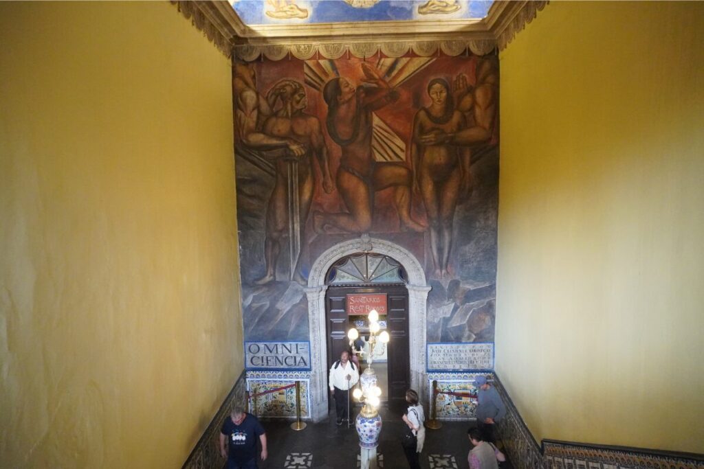 見どころのひとつは、階段の踊り場にある巨大な壁画! メキシコを代表する画家、ディエゴ・リベラの作品『全知(Omniscience)』を間近で見ることができます。食事のついでに、無料で本物のリベラ作品を鑑賞できるという贅沢さは、さすがメキシコ。