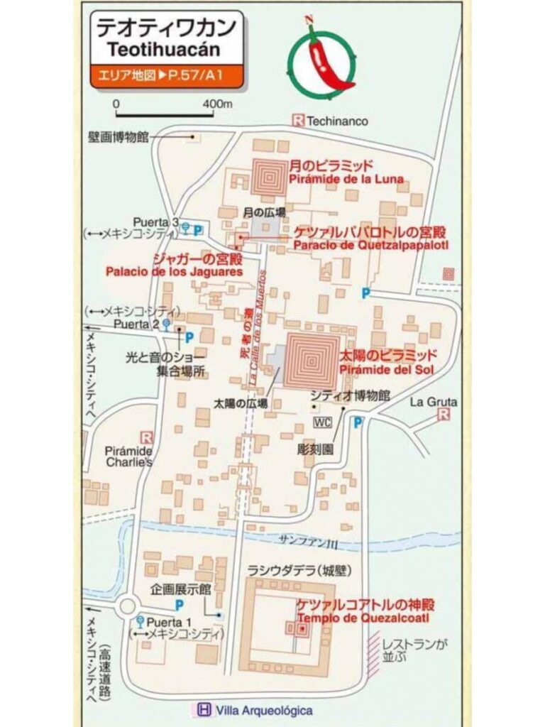 テオティワカンはかなり広大な遺跡のため、地図を頭に入れておくことが重要。どの入口から入って、どの入口から帰るか、事前に決めておくと観光がスムーズに進められる。