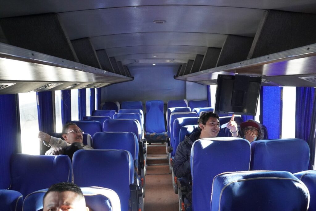 行のバス(車内)。席は決まっていないので、空いている席に座ろう。