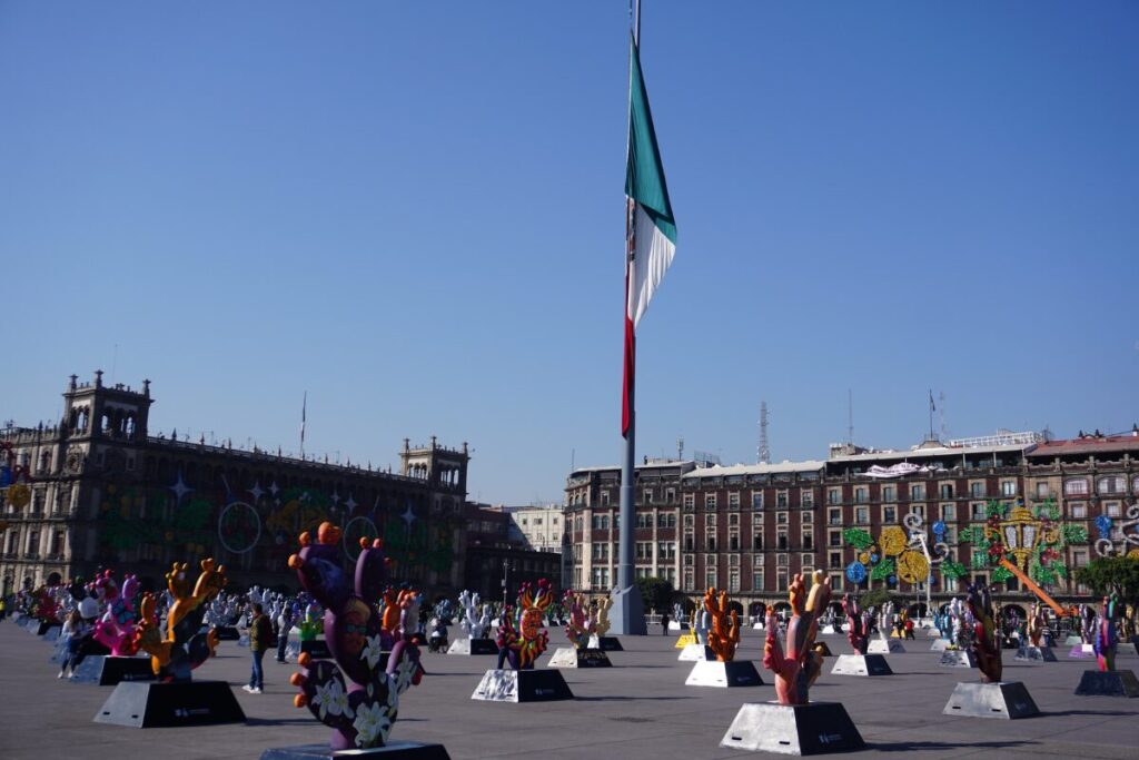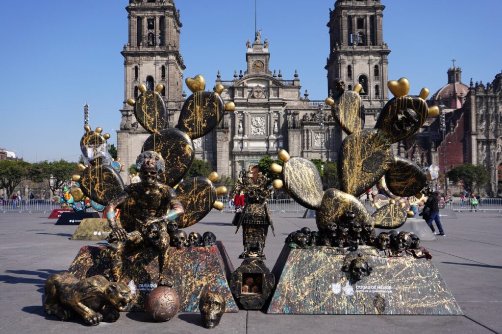 メキシコの象徴であるノパル(ウチワサボテン)を現代アートとして再解釈した展示で、歴史的な広場と前衛的な表現のコントラストが強く印象に残る。
