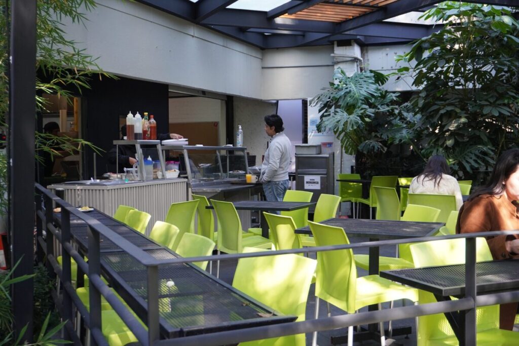 キャンパス内にはオープンエアのカフェテリアがあります。緑に囲まれたテラス席(写真参照)では、軽食やコーヒーを楽しみながら、クラスメイトとの交流を深めることができます。