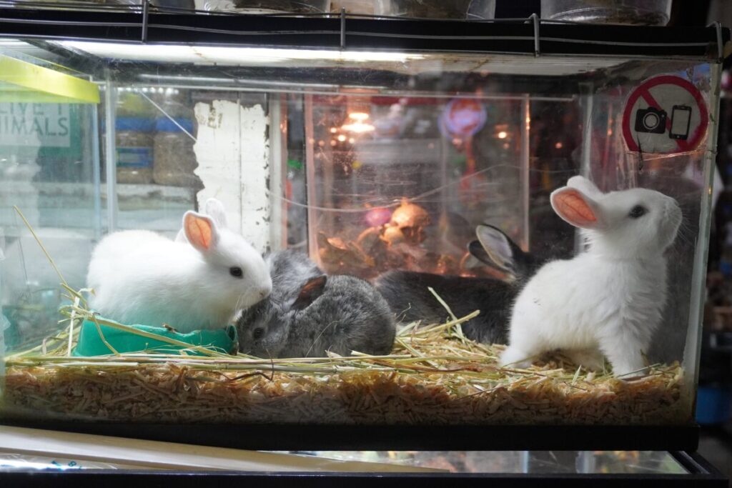 市場の奥にはペットエリアも。こんな可愛いウサギに出会えることもある。