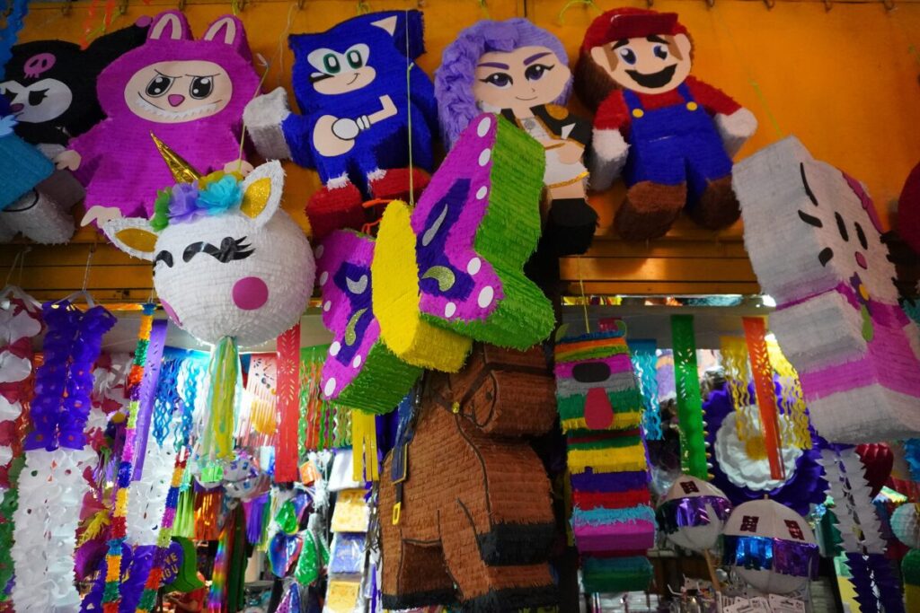お祭りに欠かせないピニャータ。日本でもおなじみのキャラクターがいるのもご愛嬌。