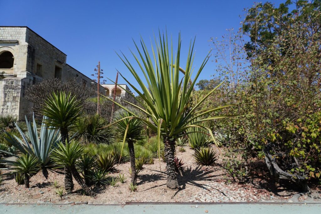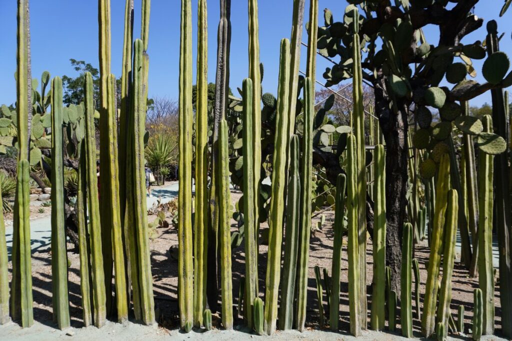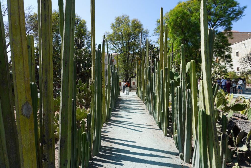 庭園に足を踏み入れると、まずそのビジュアルの強さに圧倒されます。オアハカ州はメキシコでも特に植物多様性が高い地域であり、そのエッセンスがこのコンパクトな空間に凝縮されています。