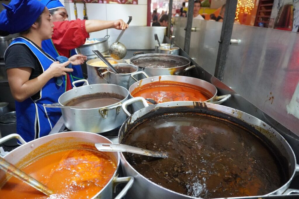 お店の入り口でまず圧倒されるのが、ずらりと並んだ巨大な鍋!手前からモレ・ネグロ、赤みがかったモレ・コロラディート、スープ類が並び、常に湯気を立てています。