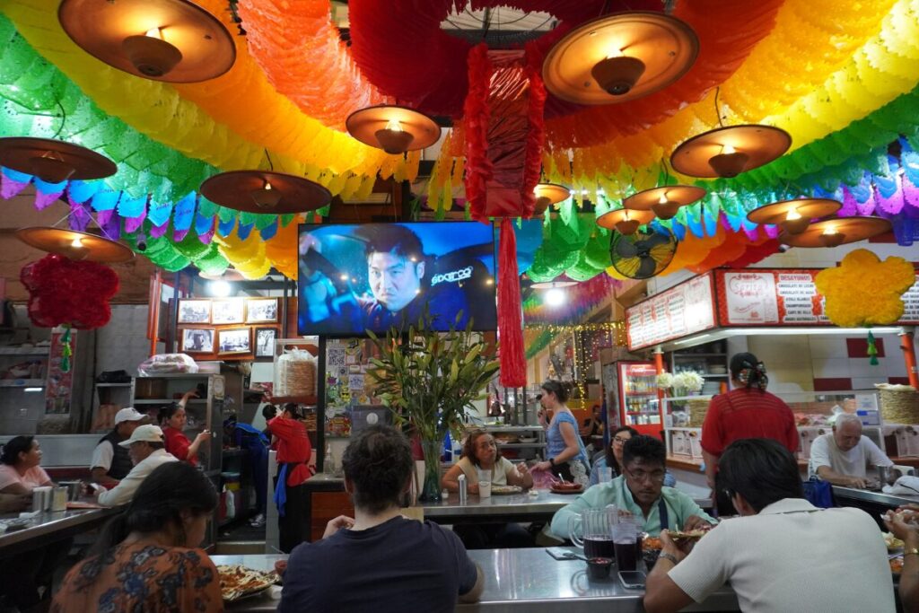 市場の中ということもあり、店内は非常にエネルギッシュ。天井を埋め尽くすカラフルな装飾(パペルピカド風の飾り)が、食事の気分を盛り上げてくれます。