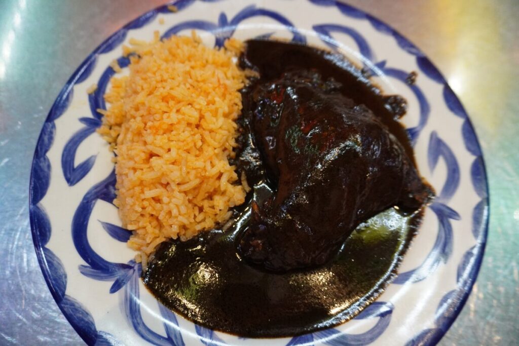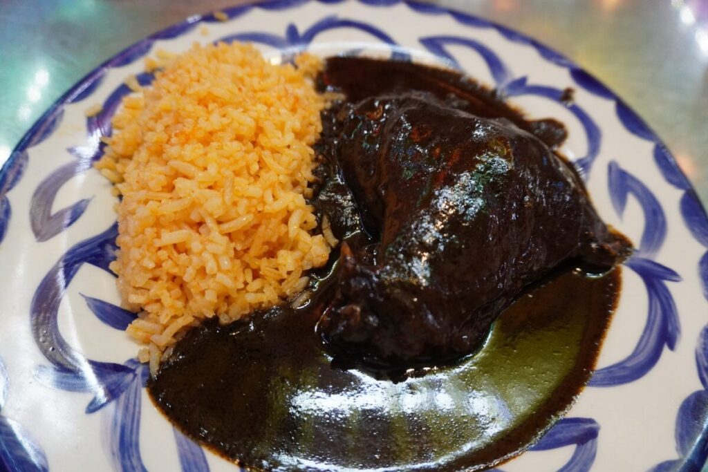 漆黒のソースが鶏肉を包み込むモレ・ネグロ。横にはメキシカンライスが添えられています。