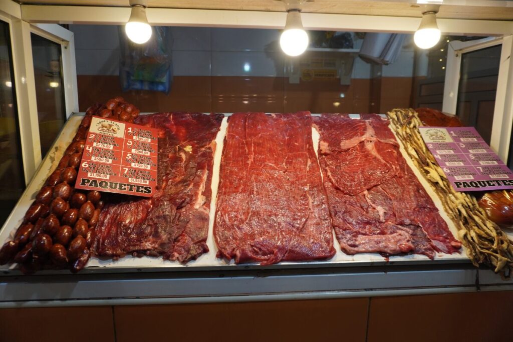 整然と並べられたタサホやチョリソ。注文に合わせて「パケテ(セット)」で頼むのがスムーズ。