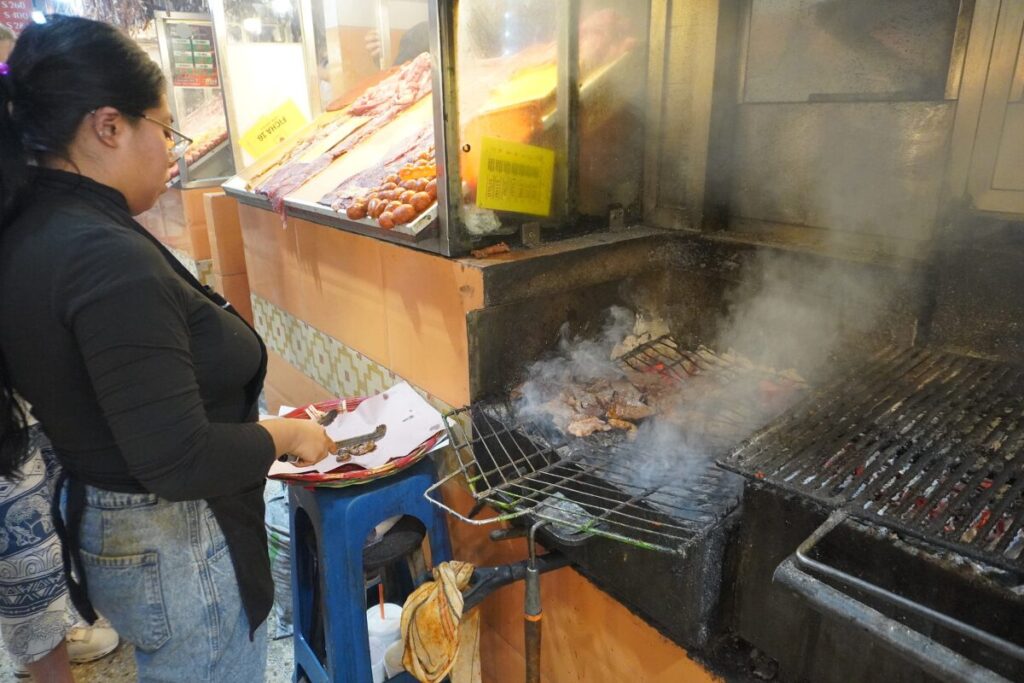 立ち上る煙の中、熟練の手つきで肉を焼き上げる様子。このライブ感こそがこの市場の醍醐味。