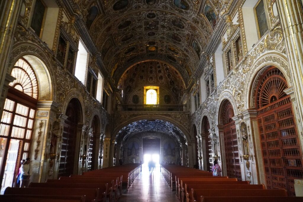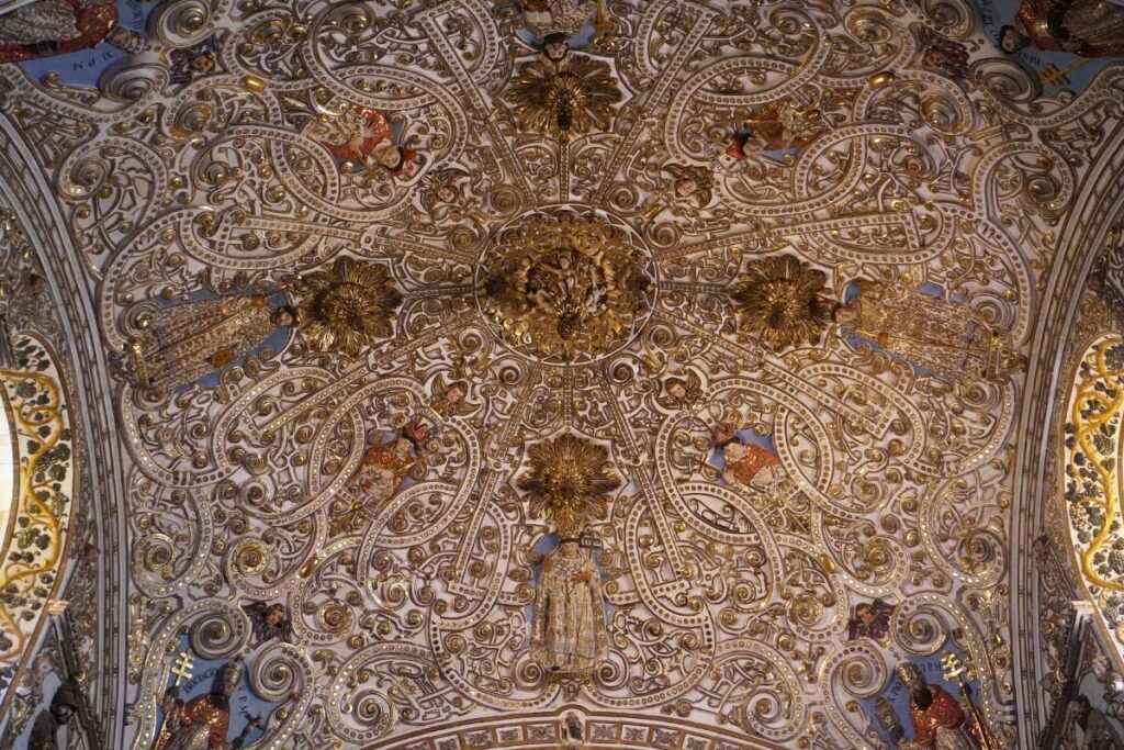 天井から壁まで、隙間なく施された彫刻。そして、それに塗られたまばゆいばかりの金箔。これこそがメキシコ・バロックの極致とも言える、チュリゲラ様式の影響を受けた豪華装飾 です。