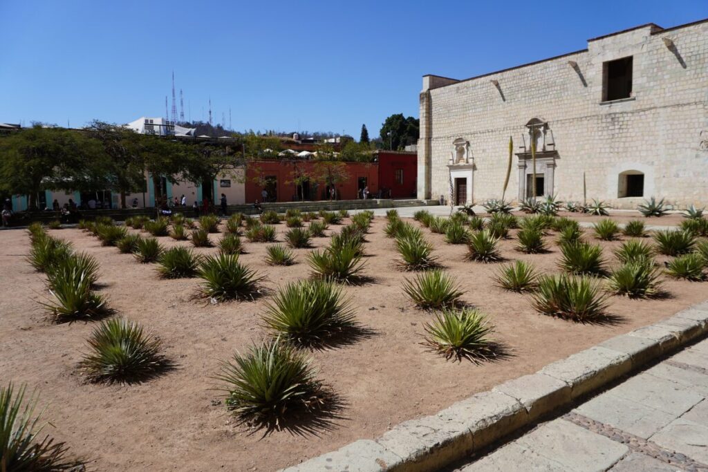 広場を彩るアガベと、隣接するオアハカ文化博物館