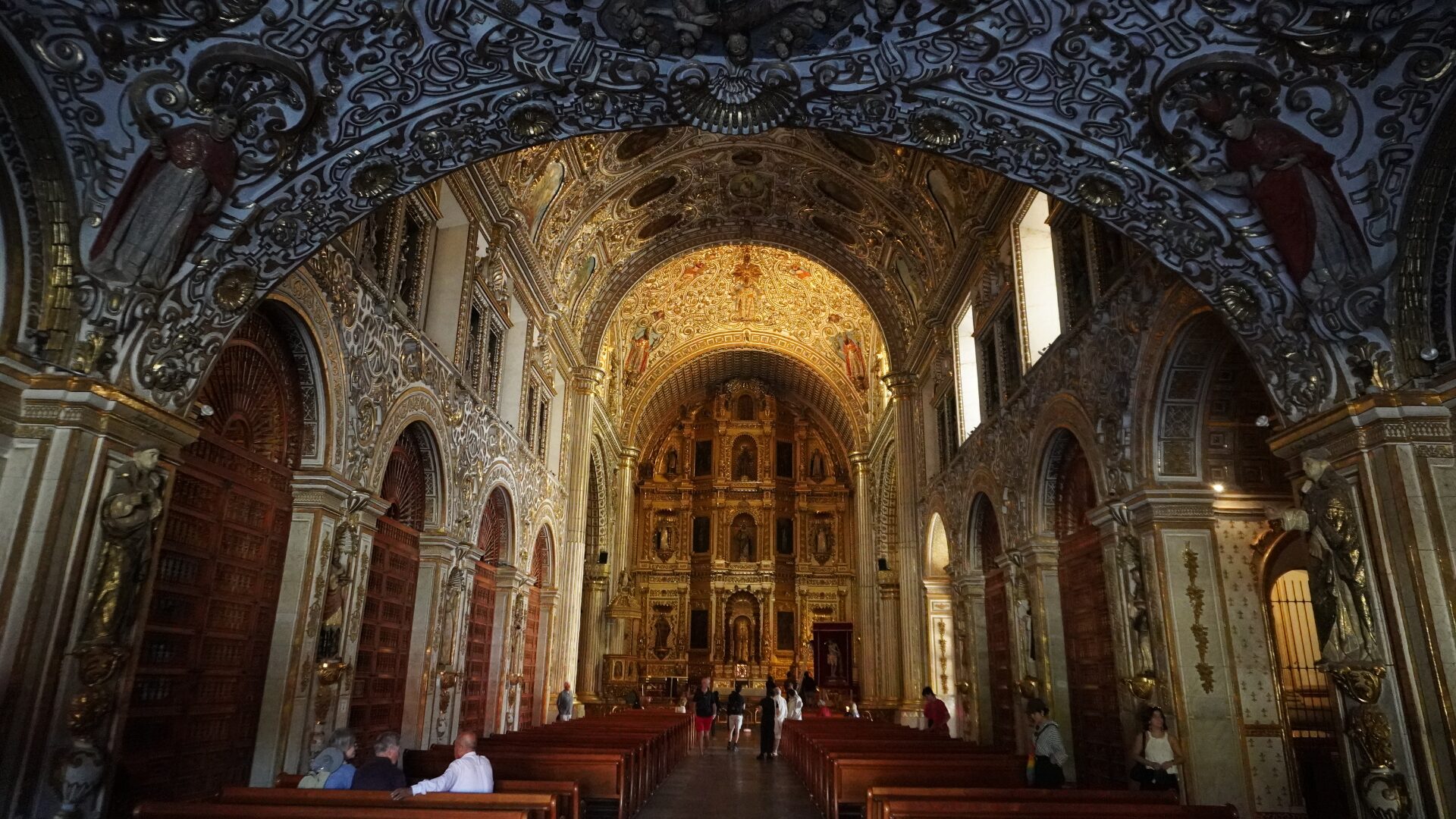祭壇を彩る黄金の彫刻群では、中央には聖ドミニコが祀られ、その周りを聖人たちが守る様子が描かれています。入口近くから眺めると、左右に並ぶアーチ、天井一面を覆う細工が、訪れる者を物語の世界へ引き込みます。