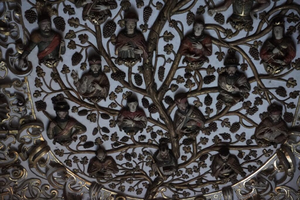 これは単なる装飾ではなく、ドミニコ会の精神的系譜 を表したもの。開祖・聖ドミニコを中心に、修道会の聖人や神学者たちが枝のように広がっていく様子が、立体的なレリーフで描かれています。工芸の街オアハカのプライドを感じさせる精巧さです。