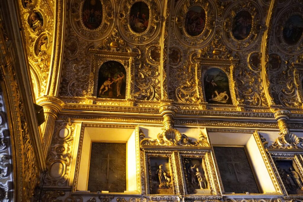 天井から壁まで、隙間なく施された彫刻。そして、それに塗られたまばゆいばかりの金箔。これこそがメキシコ・バロックの極致とも言える、チュリゲラ様式の影響を受けた豪華装飾 です。