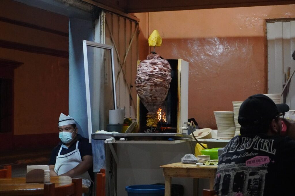 香ばしい匂いが立ち込める調理場。絶妙な火入れで焼かれるアル・パストールは必食。