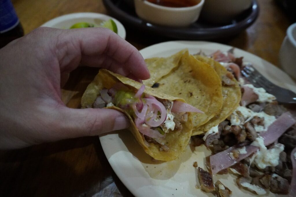 トルティーヤに好きなだけ肉とチーズを乗せ、サルサを垂らしてガブッといけば、口の中がオアハカの幸せで満たされます。