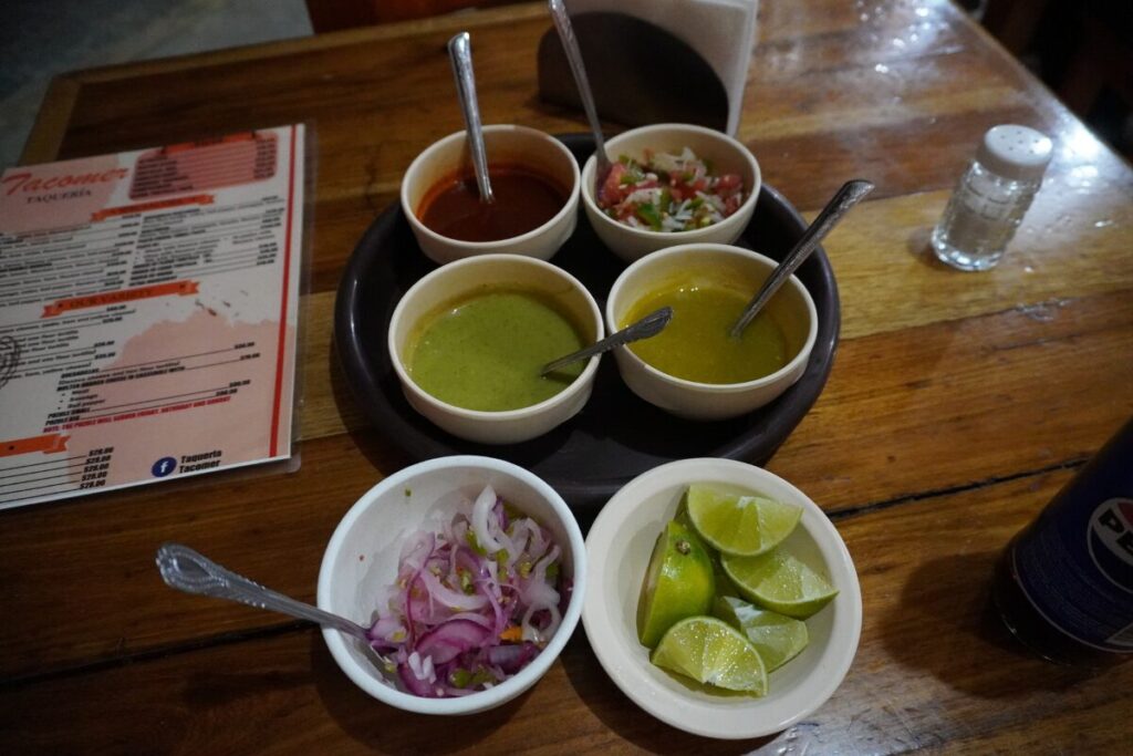 テーブルには、彩り豊かなサルサや薬味が並びます。