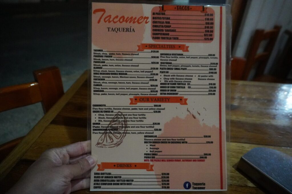主なメニュー価格タコス(18ペソ〜)、スペシャリティ(120〜130ペソ)