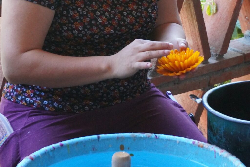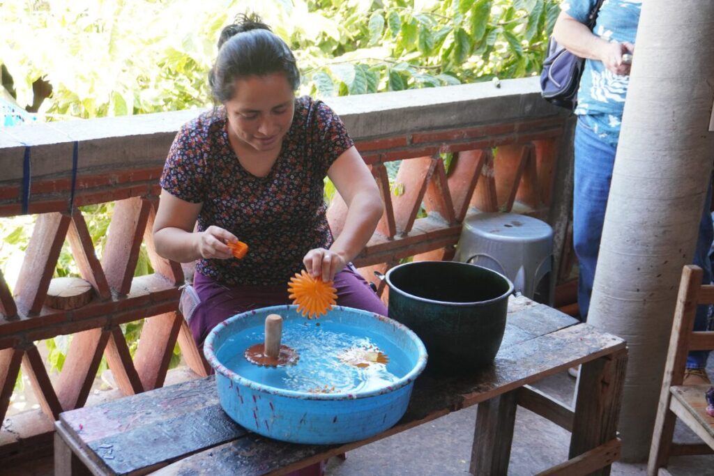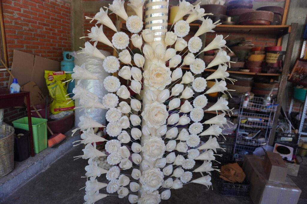 オアハカのキャンドルの最大の特徴が、この繊細な装飾です。職人が木製の型をロウに浸し、すぐに水に入れて冷やし固めることで、薄い花びらのパーツを作ります。